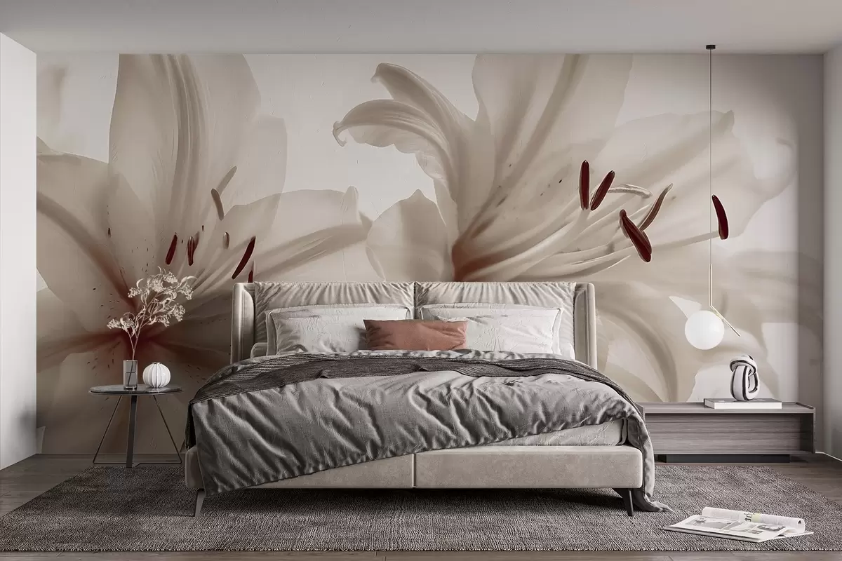 Fotomurales Primer plano con enfoque suave de flores de lirio minimalistas de color beige sobre un fondo claro Nr. w08586v1