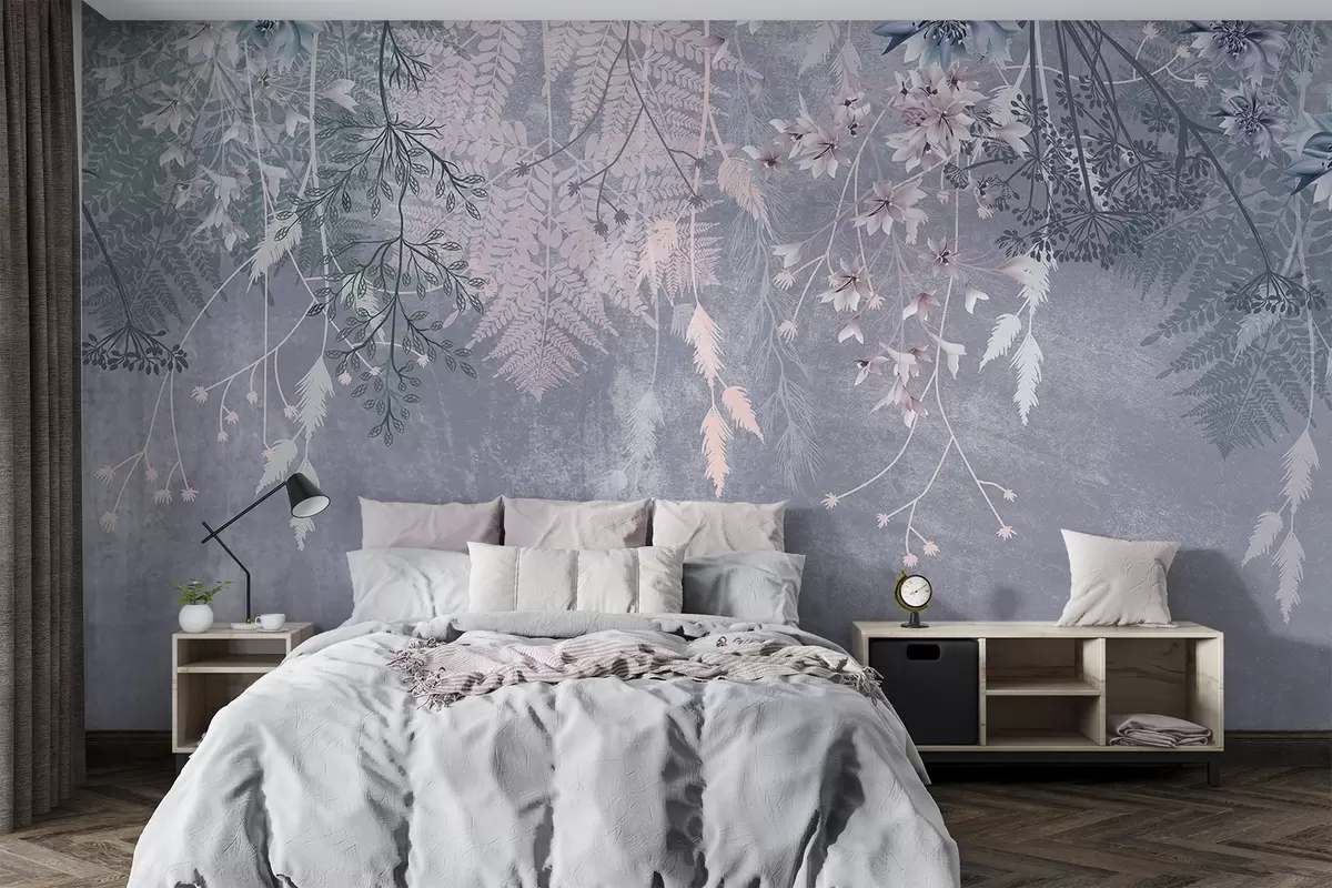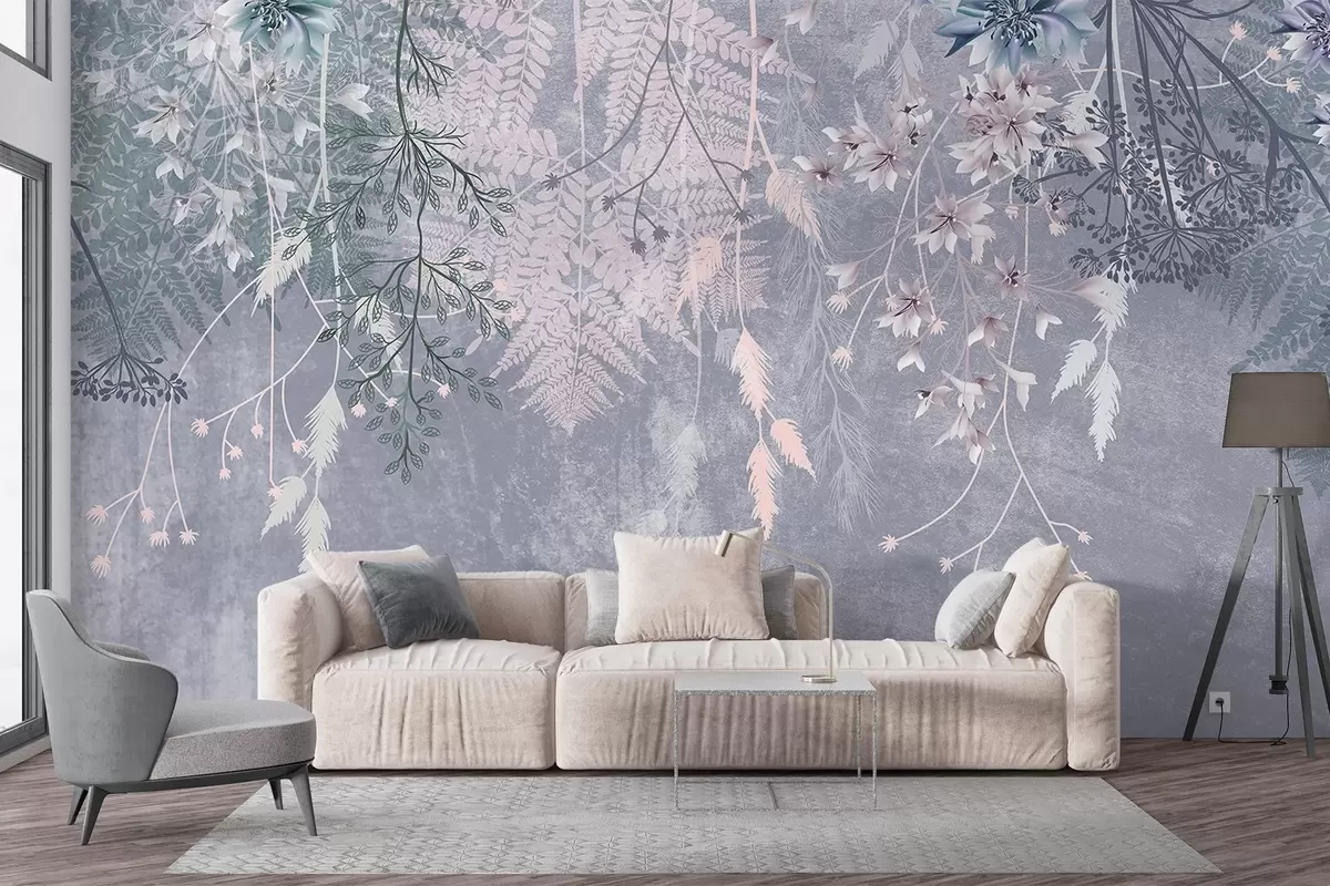 Fotomurales Unas plantas de ensueño, delicadas y tenues, espiguillas y flores en colores pastel azulados sobre un fondo brumoso y texturizado Nr. w08606
