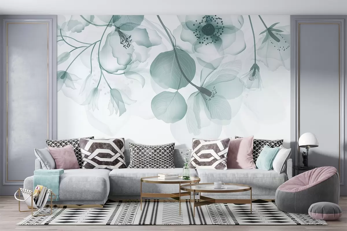 Fotomurales Delicadas flores translúcidas de color turquesa apagado, con pétalos suaves y centros oscuros, sobre un fondo claro Nr. w08613v1