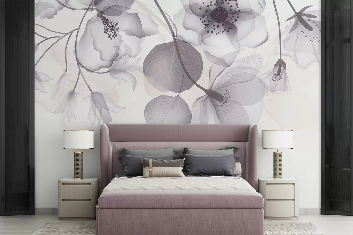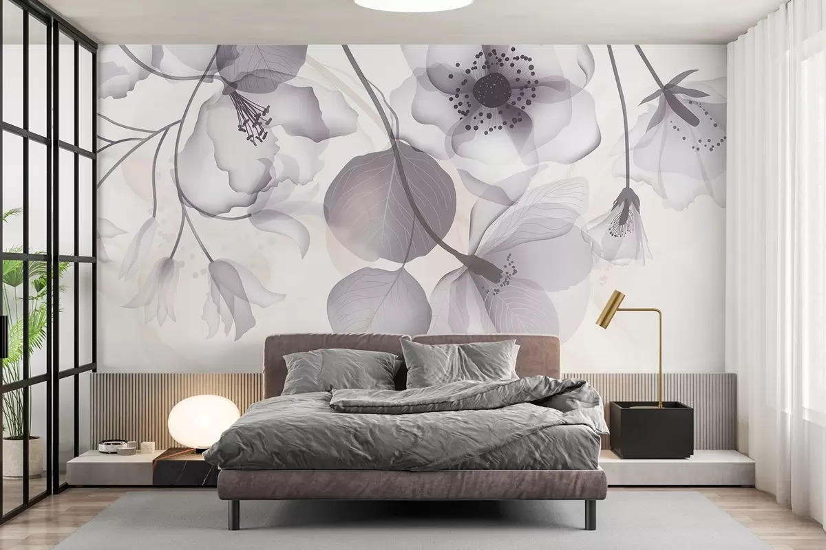 Fotomurales Delicadas flores translúcidas grises y beige con pétalos suaves y centros oscuros, sobre un fondo claro Nr. w08613v2