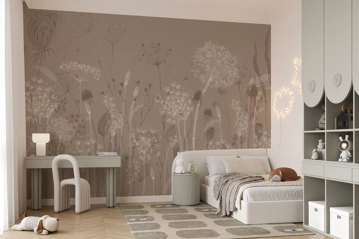 Fotomurales Gracioso estampado con delicados dientes de león, plantas y flores silvestres en tonos beige-gris Nr. w08637v2