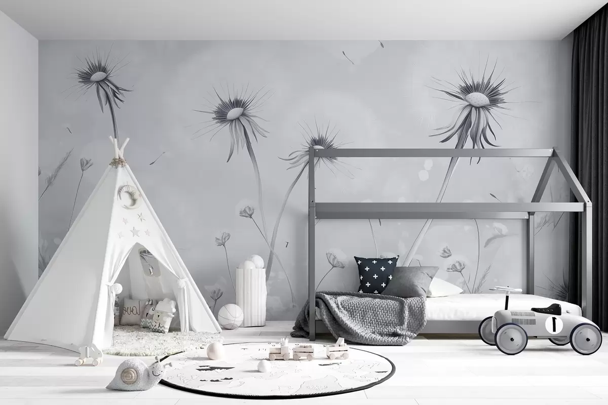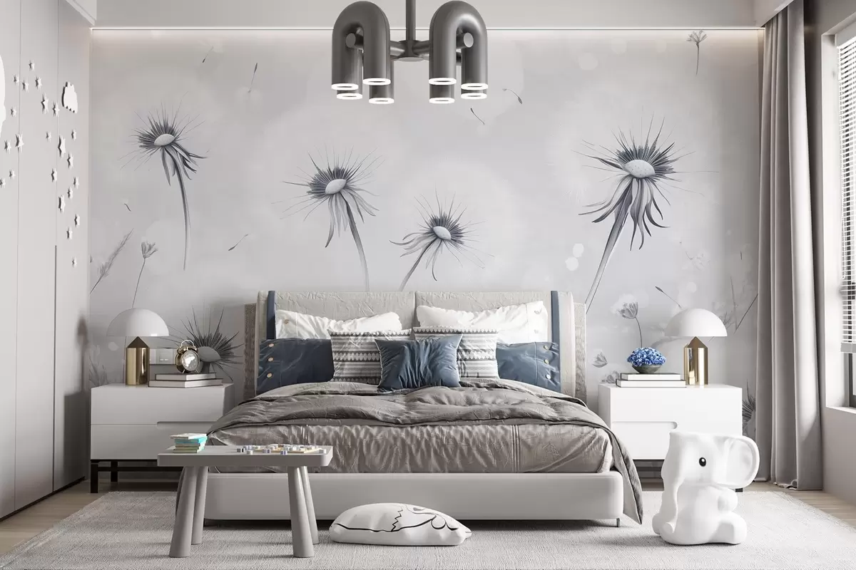 Fotomurales Elegantes dientes de león y flores silvestres en estilo pictórico en tonos azules Nr. w08657v2