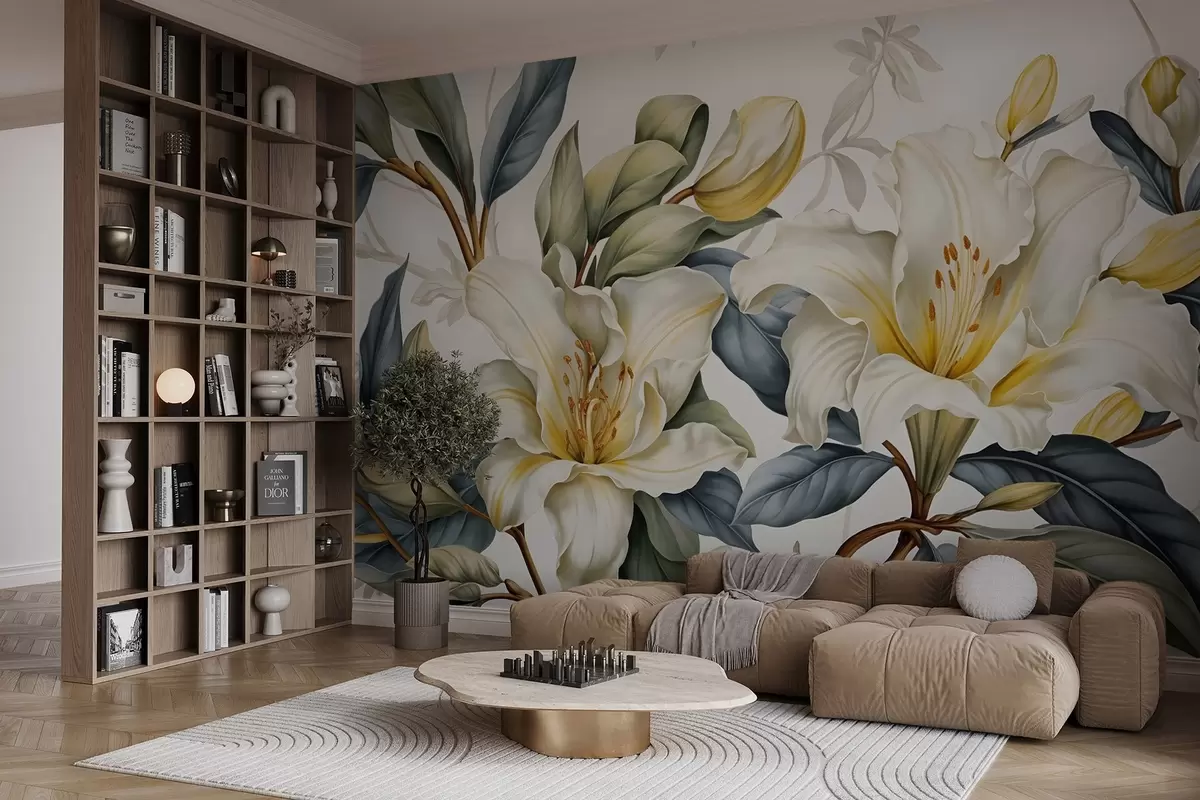 Fotomurales Pintura de lirios blancos con detalles amarillos y hojas verdes y marrones, sobre fondo claro Nr. w08661