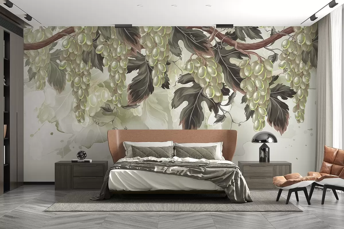 Fotomurales Uvas colgando de una parra con hojas verdes, sobre un fondo claro con texturas tipo acuarela Nr. w08696