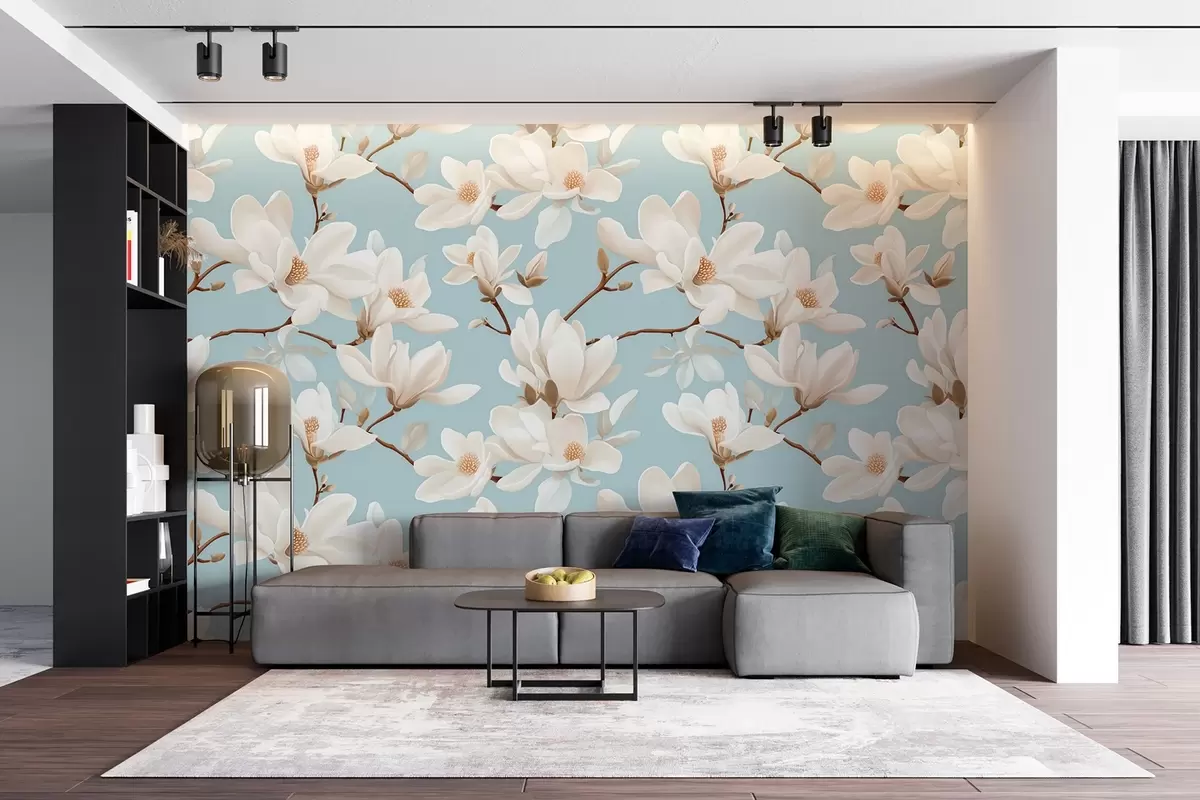 Fotomurales Patrón de flores blancas de magnolia, fondo azul pastel, hojas y ramas blancas Nr. w08726