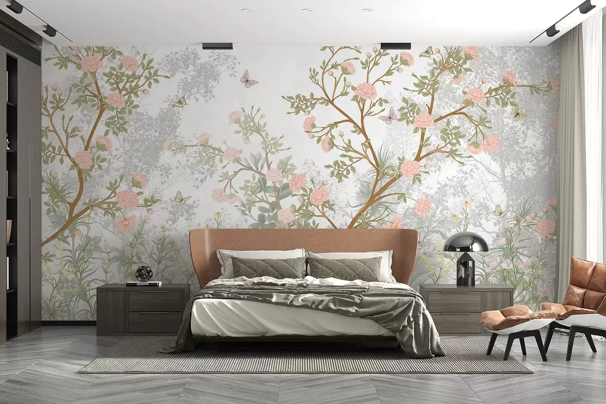 Fotomurales Delicados árboles en flor de color rosa, mariposas voladoras y hojas verdes entrelazadas con esbeltas ramas Nr. w08744