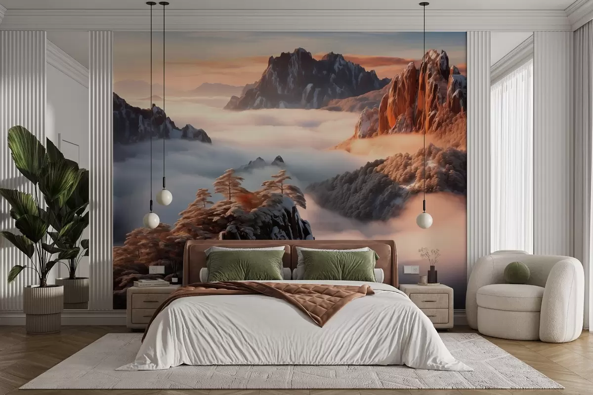 Fotomurales Encantador paisaje de montaña con niebla y árboles Nr. w08807