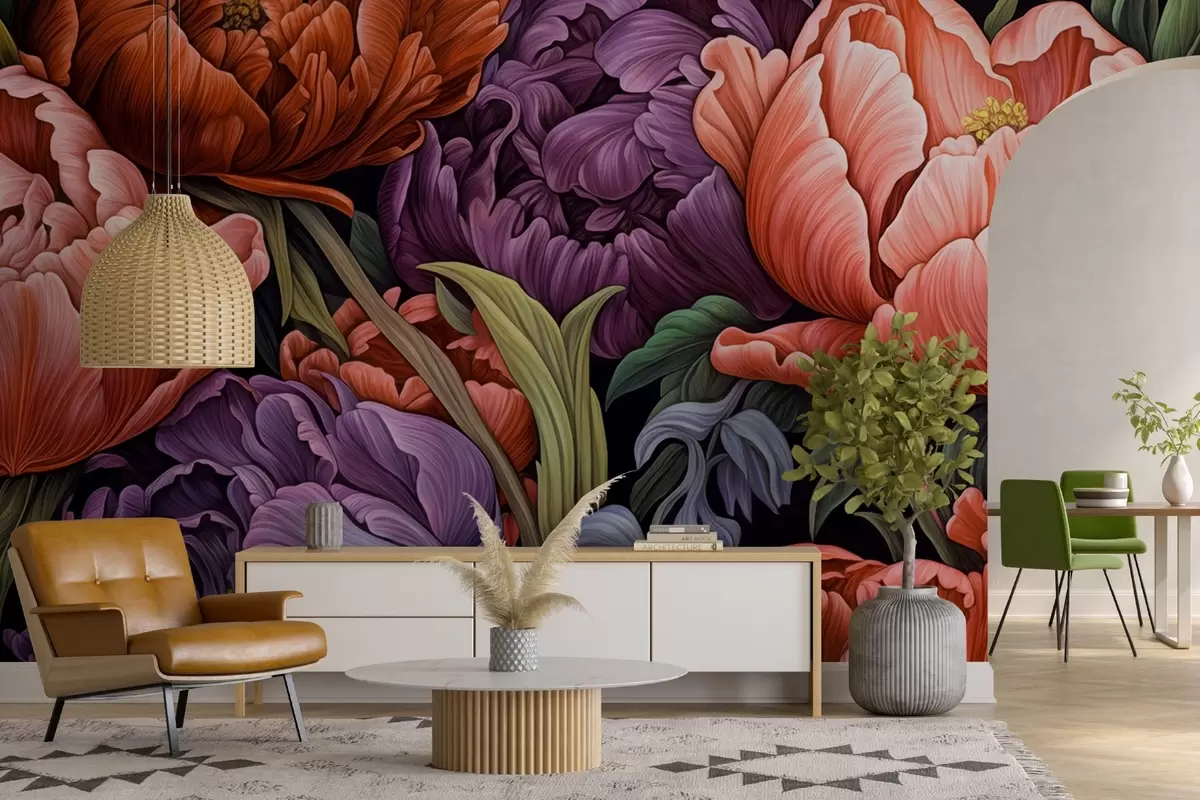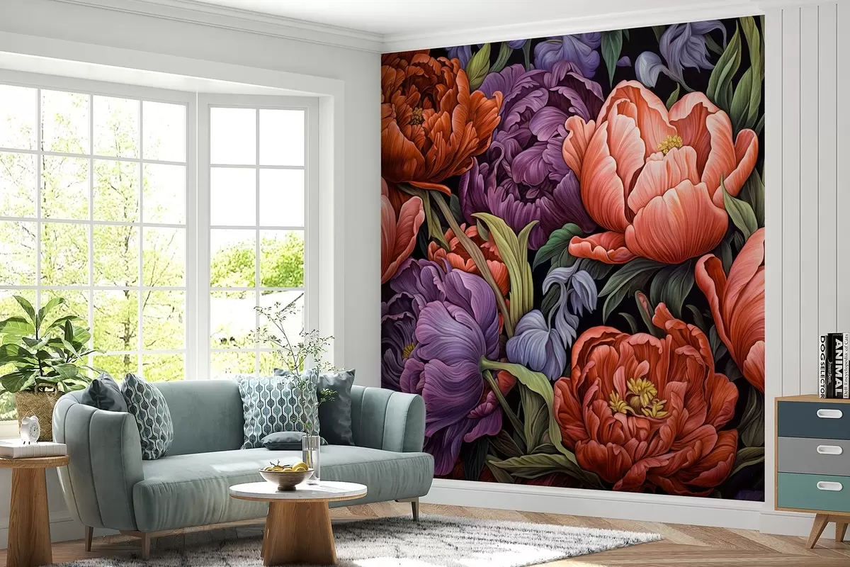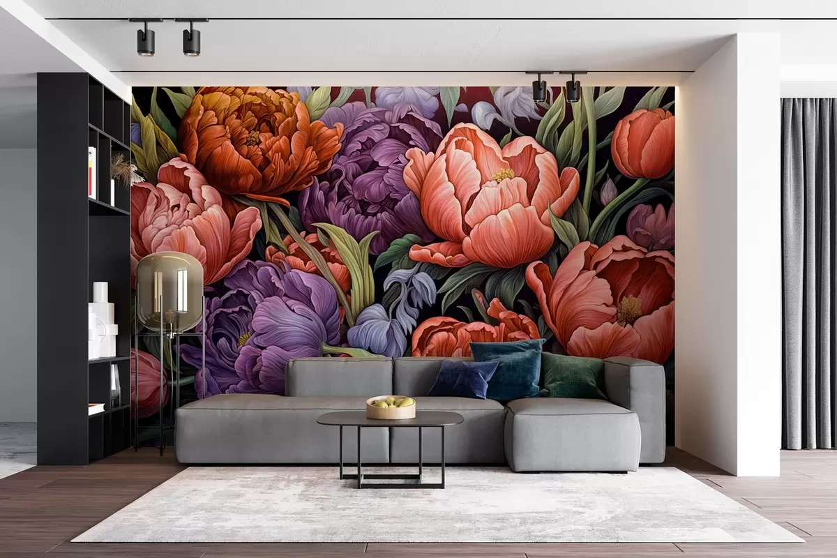 Fotomurales Tulipanes y peonías de estilo victoriano, en colores rojo y morado Nr. w08818v1