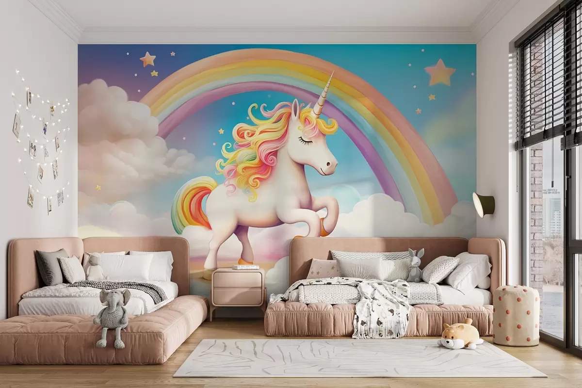 Fotomurales Un caballo unicornio con un arco iris, nubes y un cielo estrellado Nr. w08820