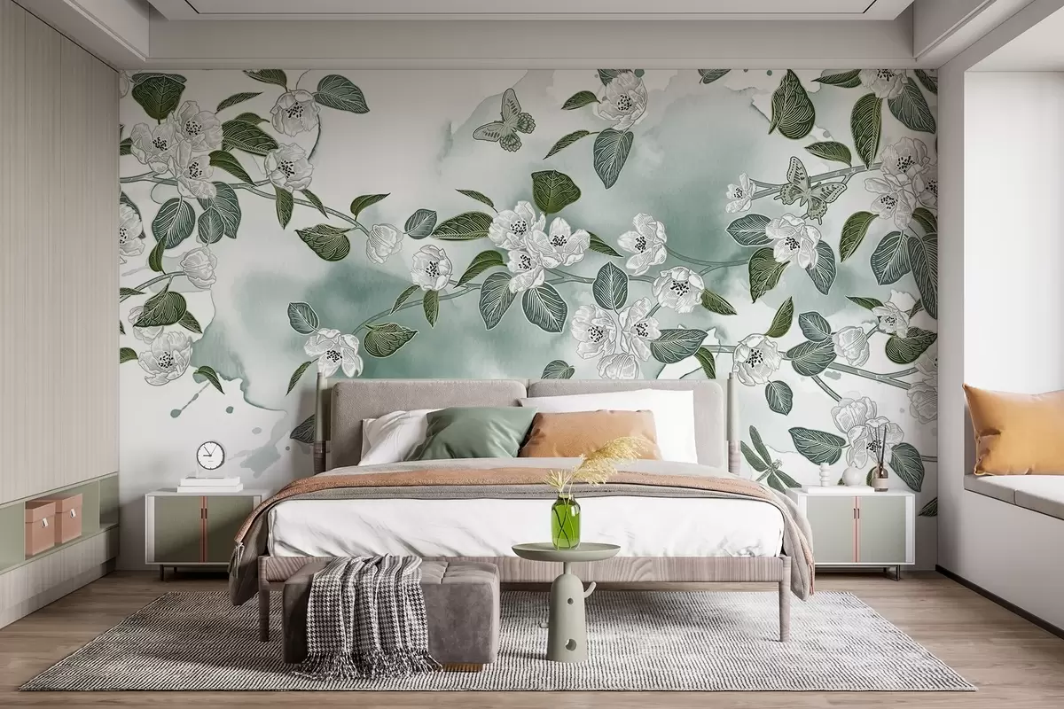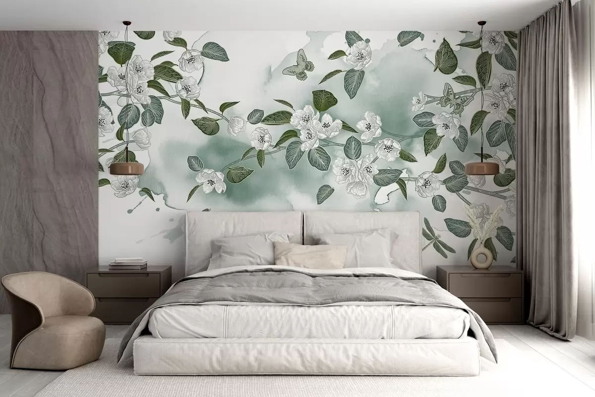 Fotomurales Ramo de cerezo en flor con flores, hojas, mariposas sobre fondo verde claro con textura de acuarela Nr. w08831