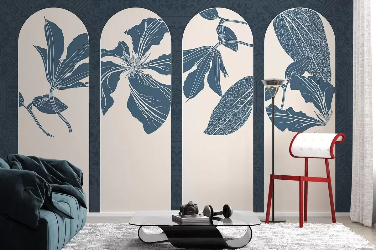 Fotomurales Elegantes arcos con diseños florales en azul oscuro y blanco, sobre fondo beige texturizado, estilo minimalista Nr. w08866v1