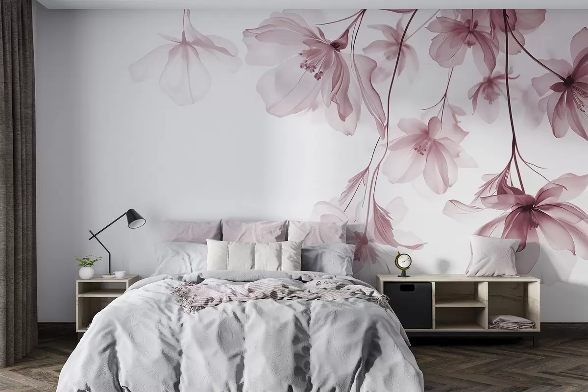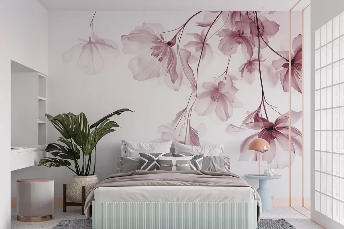Fotomurales Flores rosas con pétalos translúcidos colgando de una rama, rosa y blanco, composición minimalista de arte moderno Nr. w08911v2