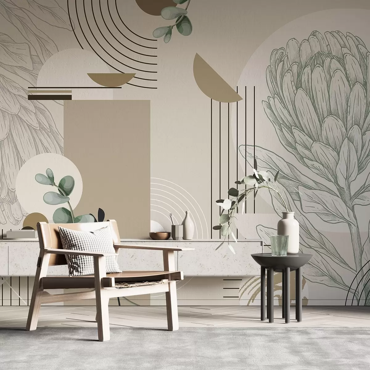 Fotomurales Estampado botánico abstracto con flor de protea, hojas de eucalipto, formas geométricas en estilo minimalista, colores pastel Nr. w08914