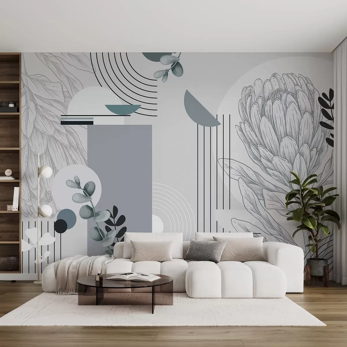 Fotomurales Estampado botánico abstracto con flor de protea, hojas de eucalipto, formas geométricas en estilo minimalista, colores pastel Nr. w08914v1