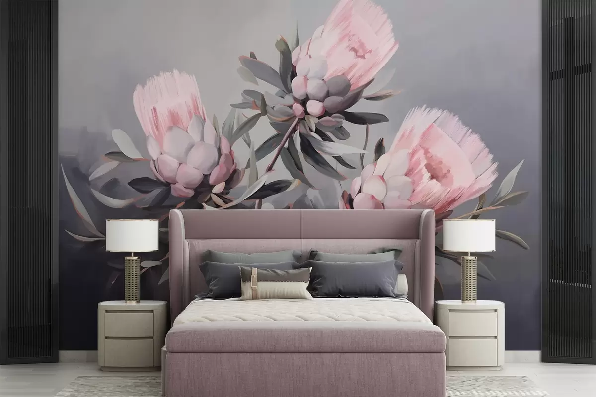 Fotomurales Flores abstractas de protea rosa con hojas grises, pinceladas de textura suave, colores apagados, sobre fondo gris difuminado Nr. w09014