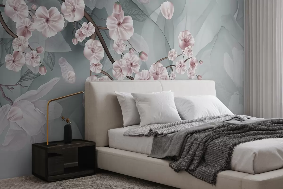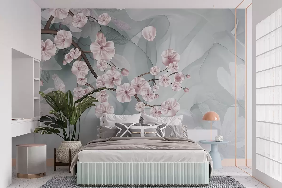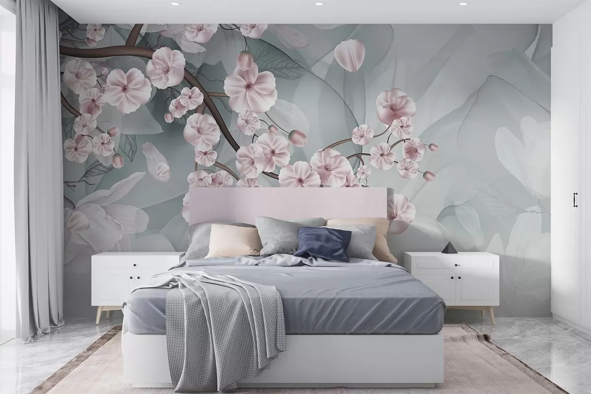 Fotomurales Ramas de cerezo en flor con flores y pétalos rosas, ramas marrones, fondo abstracto apagado con efecto fluido Nr. w09054