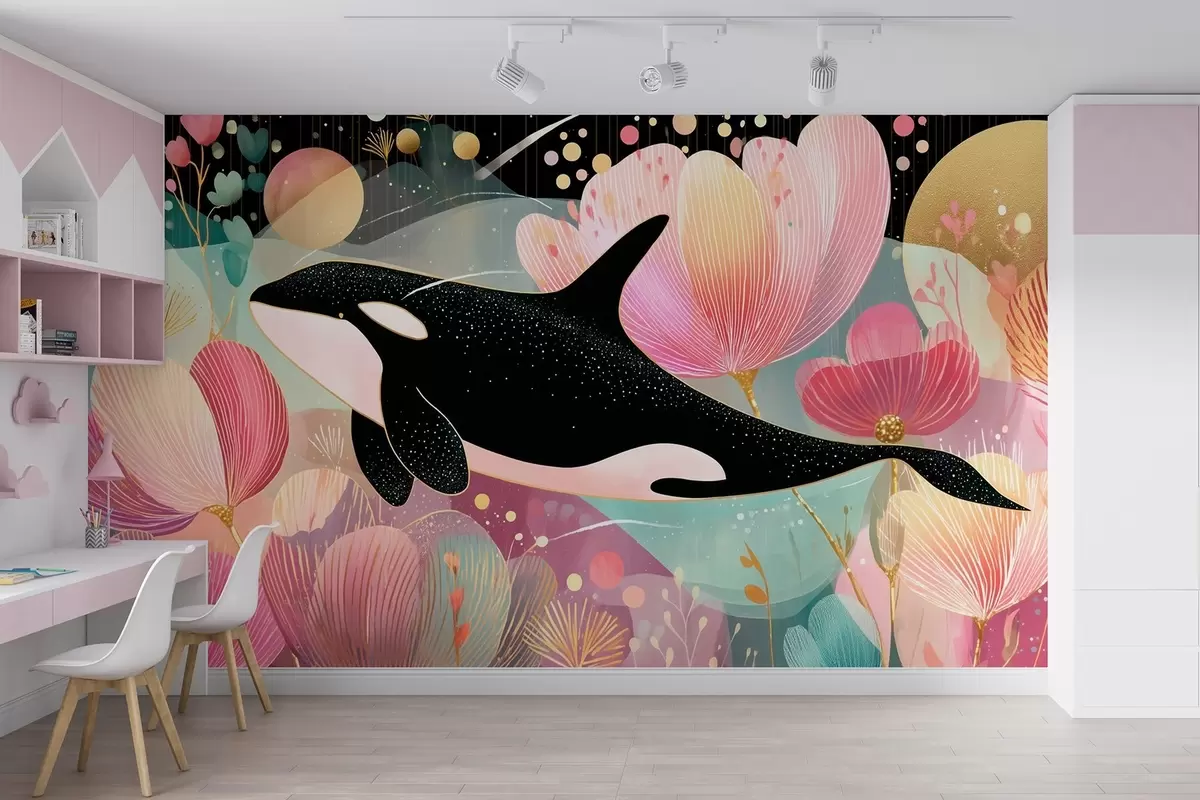 Fotomurales Una orca negra nadando sobre un fondo de flores rosas Nr. w09074