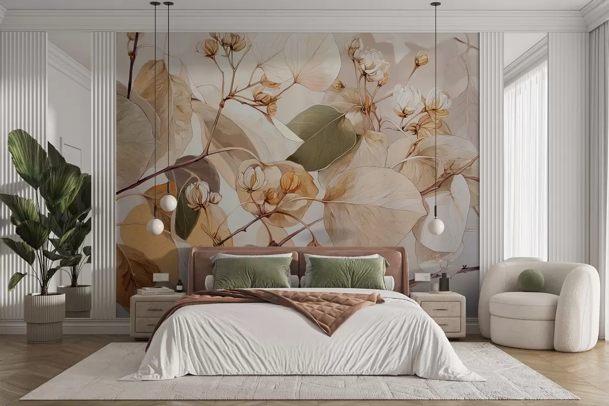 Fotomurales Ramas de hojas y flores de álamo temblón al óleo en tonos beige Nr. w09082