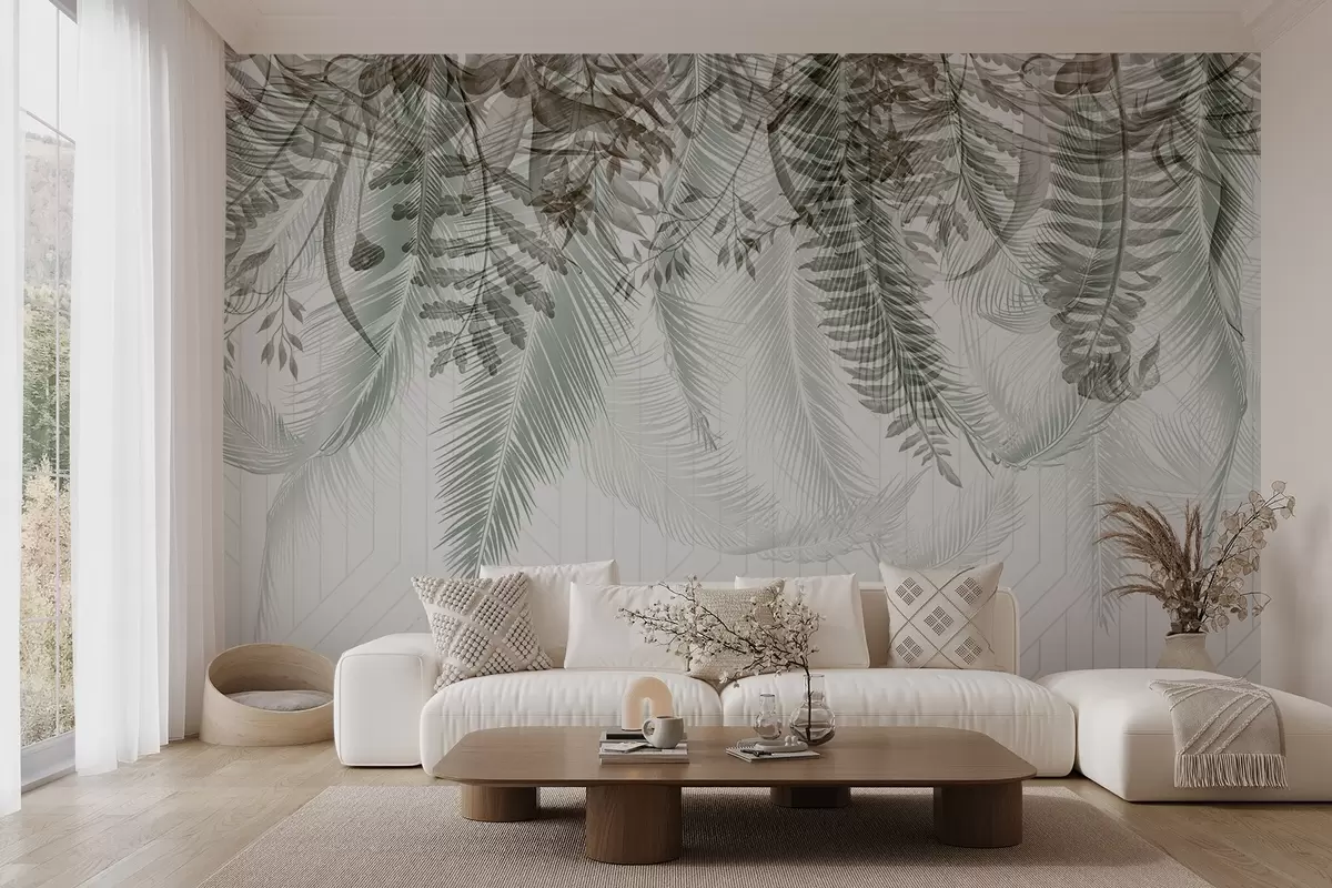Fotomurales Delicada caída de helechos tropicales y hojas de palmera, fondo geométrico, luz suave, colores apagados, elegante Nr. w09106v1