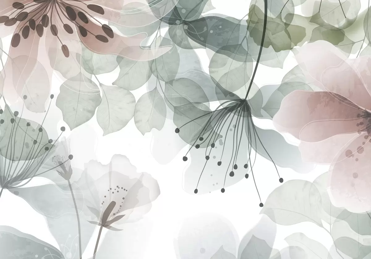 Fotomurales Flores y hojas en colores pastel, pétalos y hojas translúcidos, suave efecto acuarela, líneas delicadas, fondo blanco Nr. w09107
