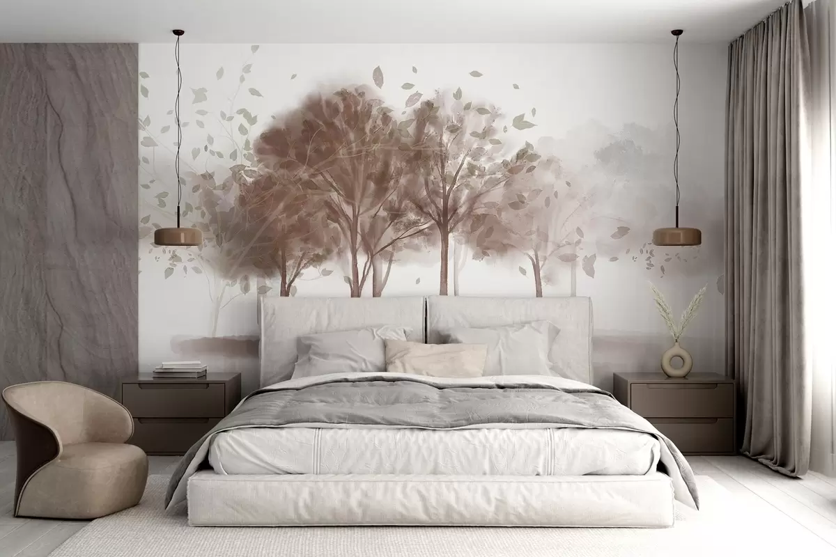 Fotomurales Paisaje abstracto con árboles de hojas marrones reflejándose en el agua, en estilo acuarela texturizada Nr. w09109v1