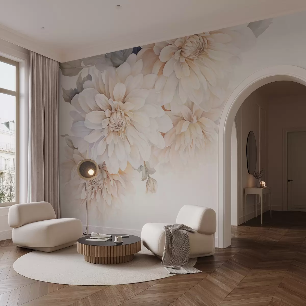 Fotomurales Dalias pastel con pétalos suaves y delicados de color melocotón y blanco claro en estilo acuarela, fondo suave Nr. w09115