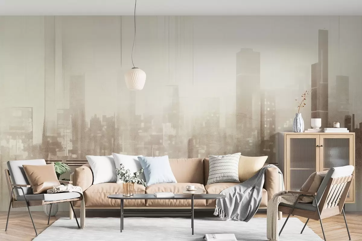 Fotomurales Paisaje urbano abstracto texturizado con edificios altos y bandas, en tonos beige y blanco, creando un efecto brumoso Nr. w09119v1