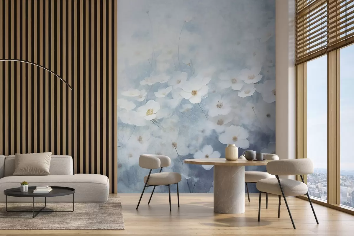 Fotomurales Campo texturizado de flores blancas de anémona, enfoque suave, atmósfera de ensueño, paleta de colores azul claro y blanco, prado primaveral Nr. w09134