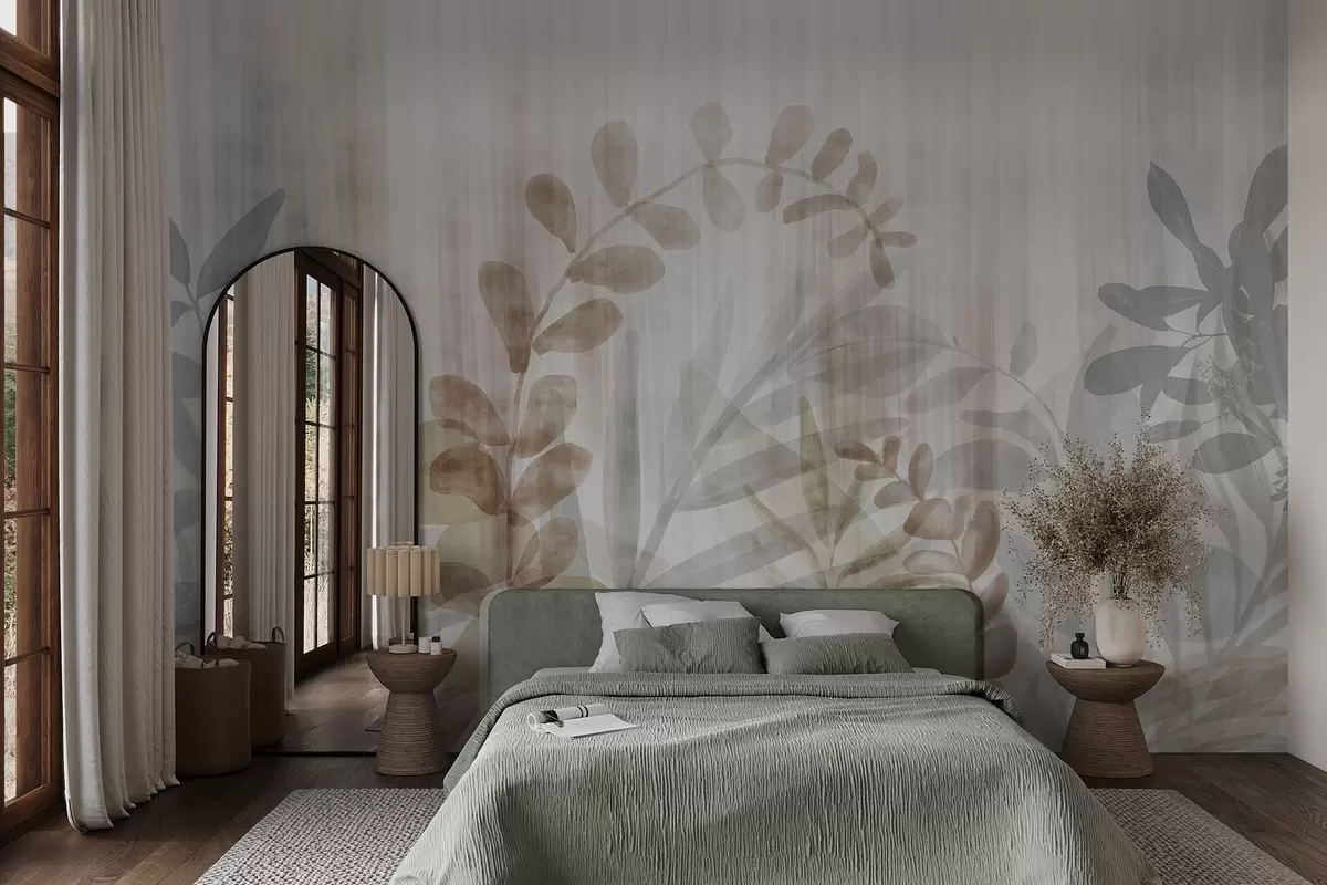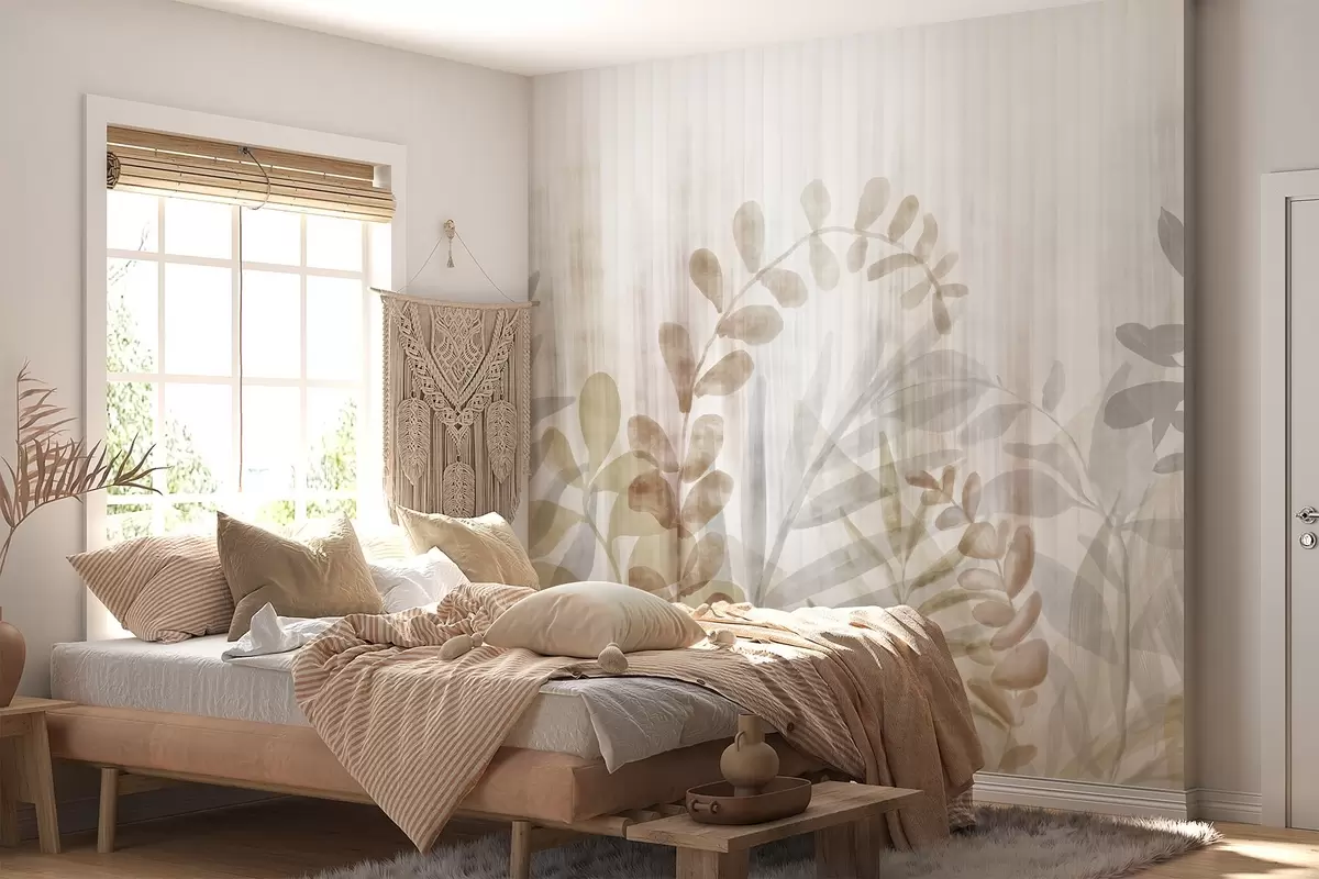 Fotomurales Pintura acuarela imitación de plantas con hojas multicolores apagadas, fondo claro con líneas verticales, ilustración botánica Nr. w09146