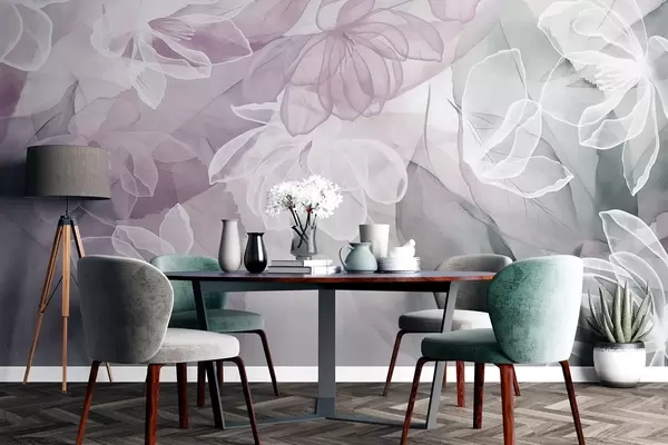 Fotomurales Flores y hojas con pétalos transparentes en tonos blancos, rosas y verdes, suaves y delicados Nr. w09158v1