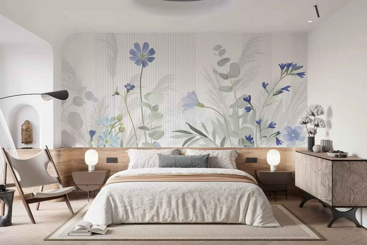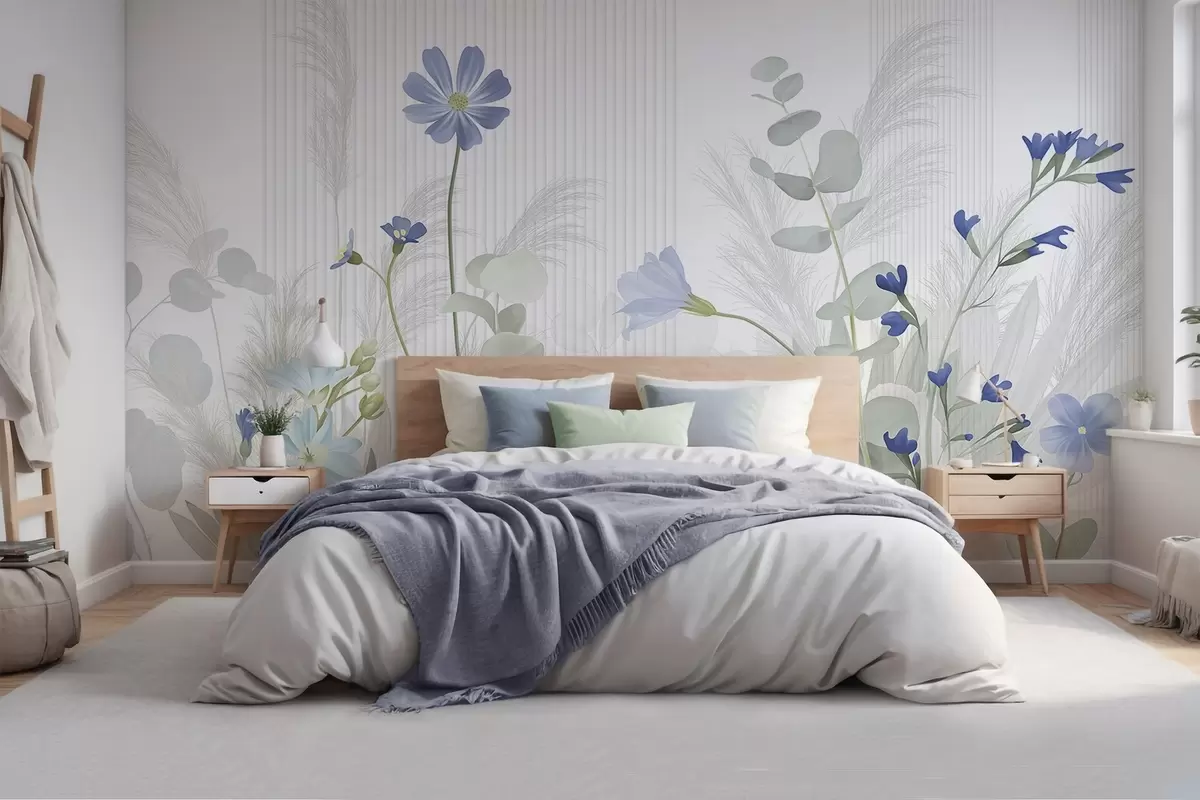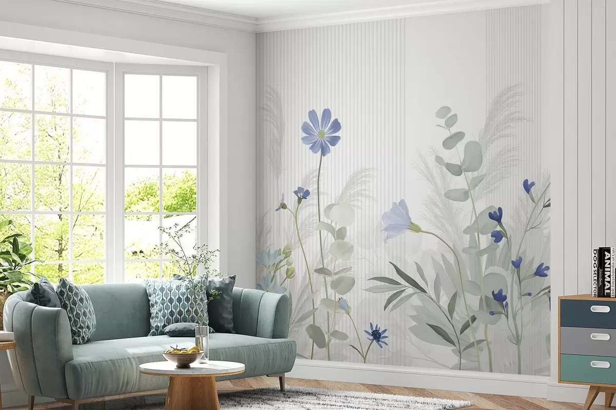 Fotomurales Flores en colores pastel, hojas verde claro, fondo blanco con líneas verticales, elegante y minimalista Nr. w09161v1