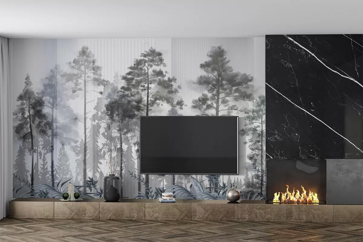 Fotomurales Un denso bosque con altos pinos, exuberante follaje gris, una atmósfera brumosa con texturas de líneas verticales Nr. w09163v2
