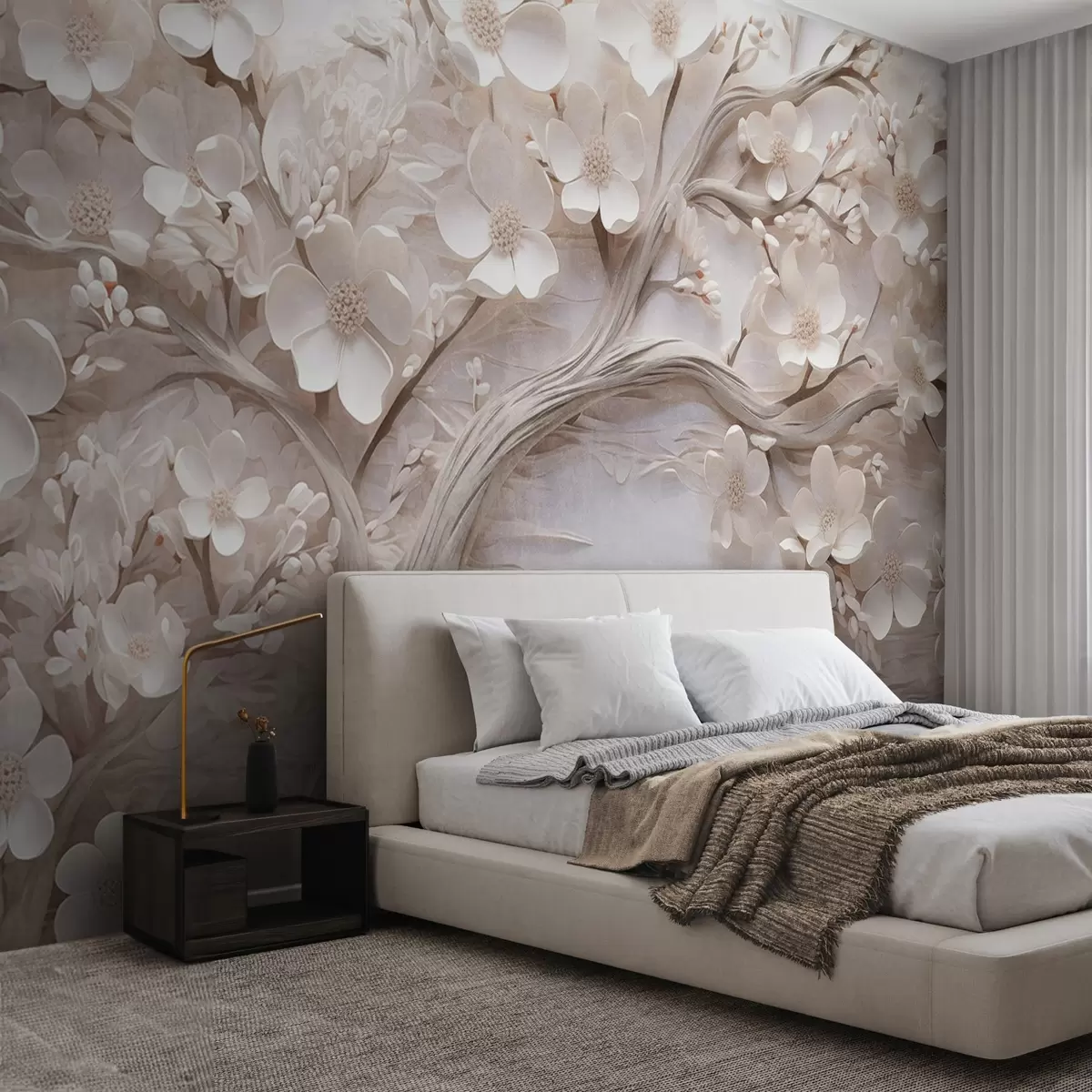 Fotomurales Árbol texturizado con flores blancas y tronco marrón, el fondo es blanco con líneas horizontales iluminación suave Nr. w09166