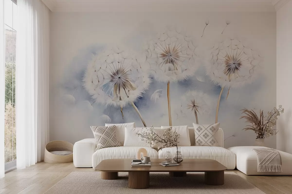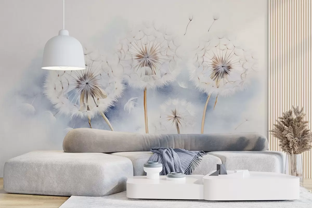 Fotomurales Dientes de león texturizados con semillas flotando en el aire, fondo azul claro y blanco, estilo de dibujo suave y delicado Nr. w09190
