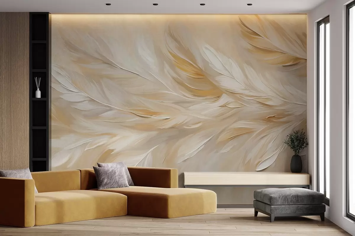 Fotomurales Plumas blancas y beige dispuestas en un estampado fluido, textura suave, paleta de colores cálidos, fondo abstracto Nr. w09191