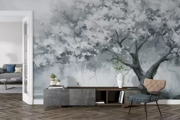 Fotomurales Abstracto árbol en flor azul apagado en plena floración, junto a un río, pinceladas de textura suave y colores pastel Nr. w09193v2