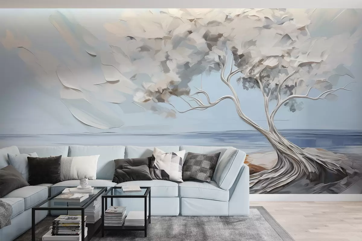 Fotomurales Un árbol blanco con hojas gruesas y texturadas en una playa de arena, paisaje con cielo azul claro Nr. w09205