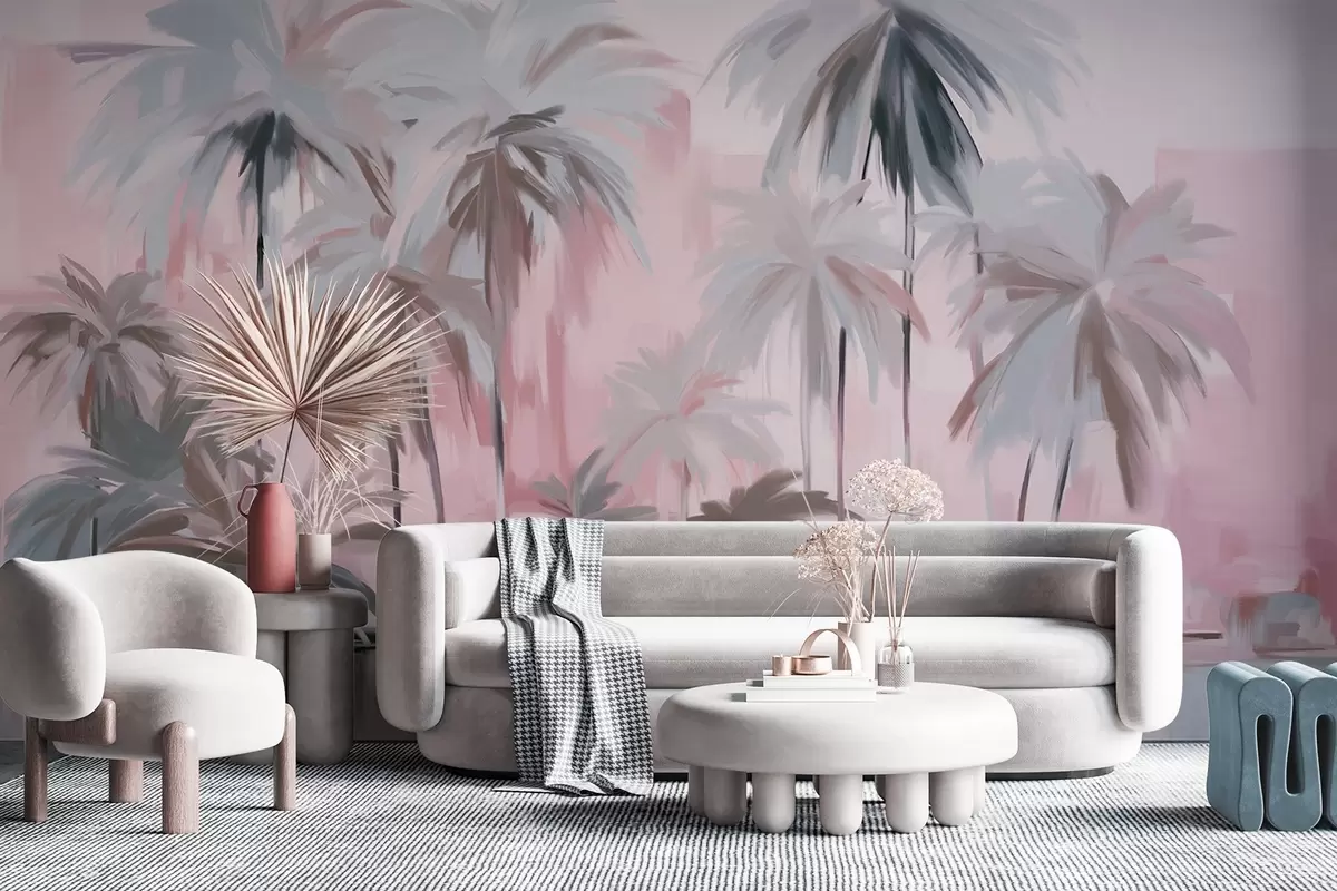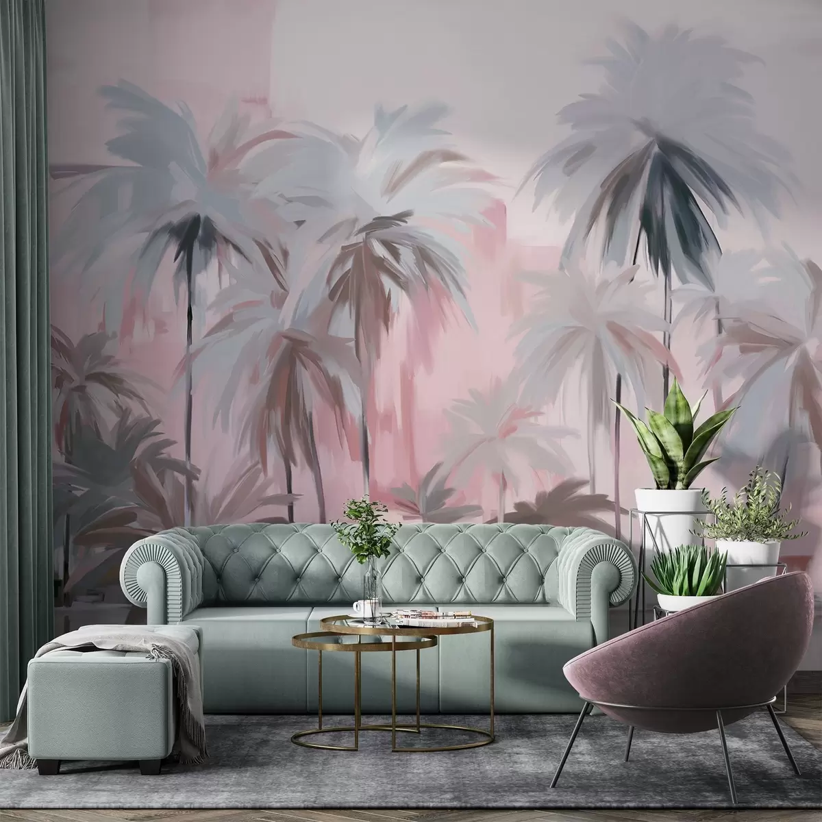 Fotomurales Palmeras tropicales abstractas minimalistas en tonos pastel, sobre un fondo de tonos rosas y grises apagados Nr. w09212v1