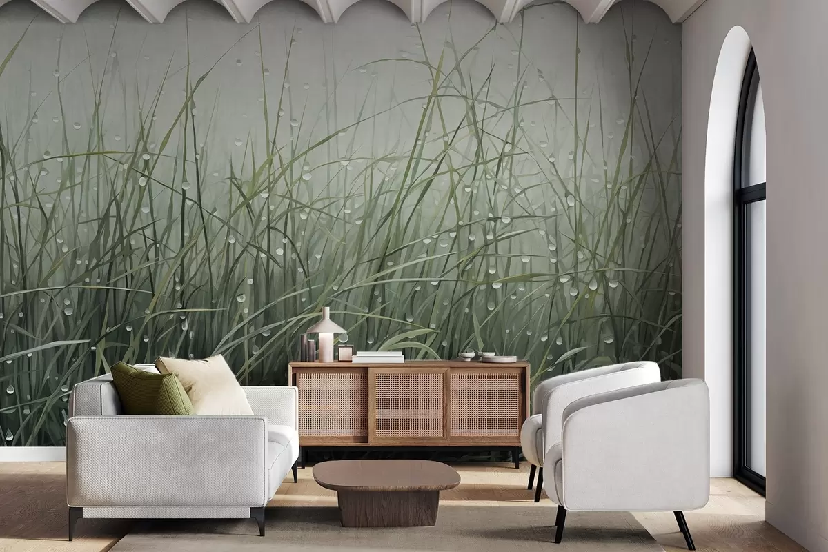 Fotomurales Hierba con gotas de agua, tonos verdes apagados, luz suave, fondo brumoso, estilo abstracto minimalista texturizado Nr. w09217