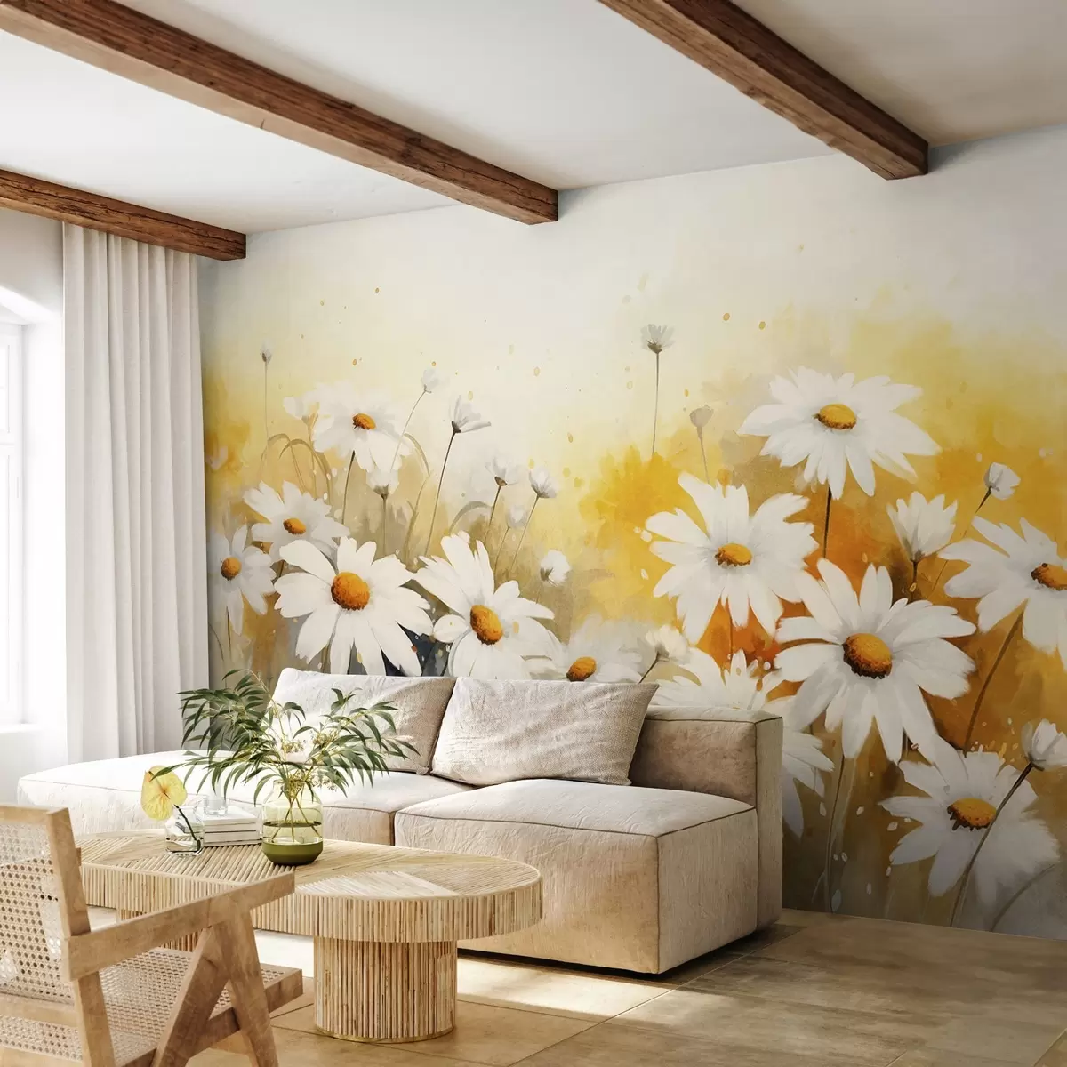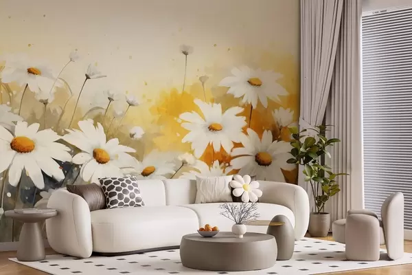 Fotomurales Un campo de margaritas blancas con centros amarillos, sobre un suave fondo amarillo y beige, estilo acuarela Nr. w09218