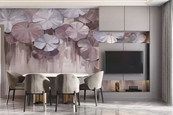 Fotomurales Nenúfares texturizados con colores violeta y azul en un estanque, el fondo es una mezcla borrosa de suaves tonos morados Nr. w09255v1