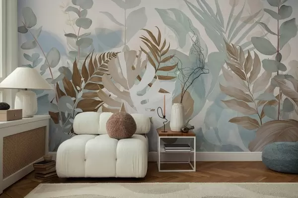 Fotomurales Plantas pastel helechos, monstera y eucalipto, fondo de textura ligera, iluminación suave, tranquilo , ilustración botánica Nr. w09316v1