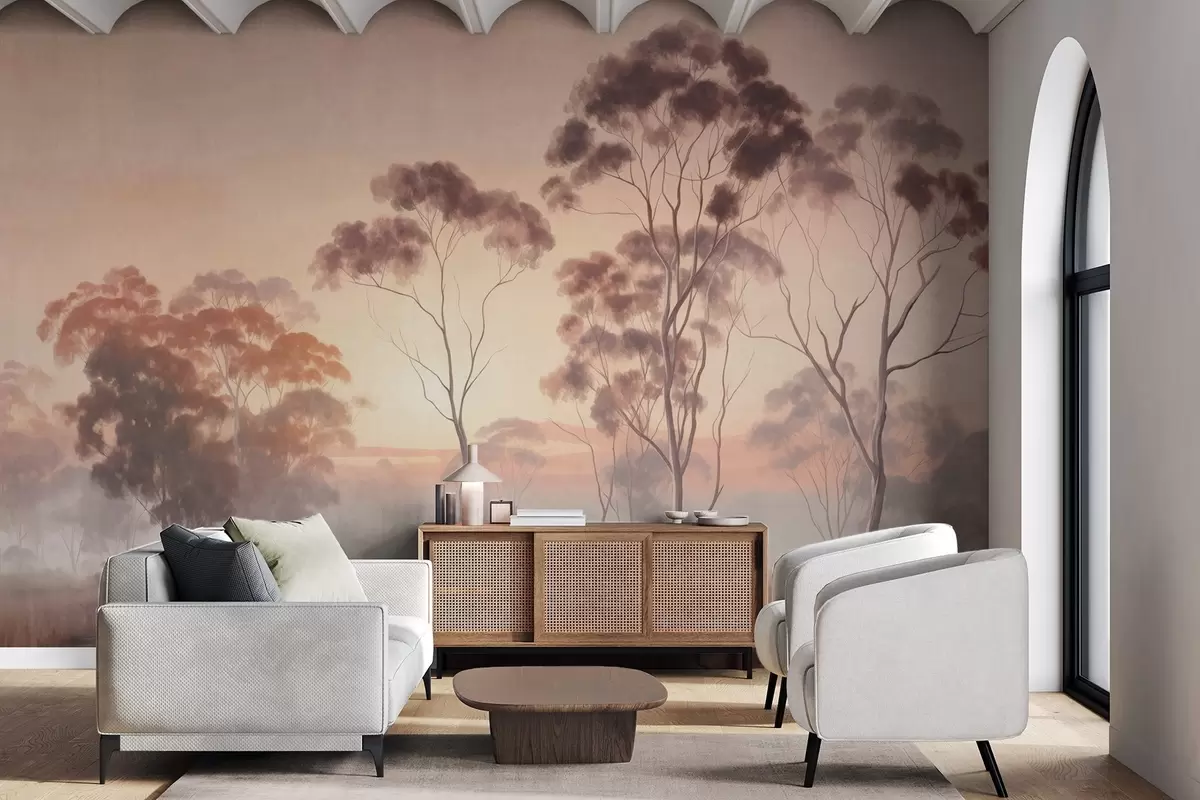 Fotomurales Un paisaje con eucaliptos en un campo con cielo rosa pastel y naranja, una ligera niebla, pintura estilo texturizado Nr. w09367
