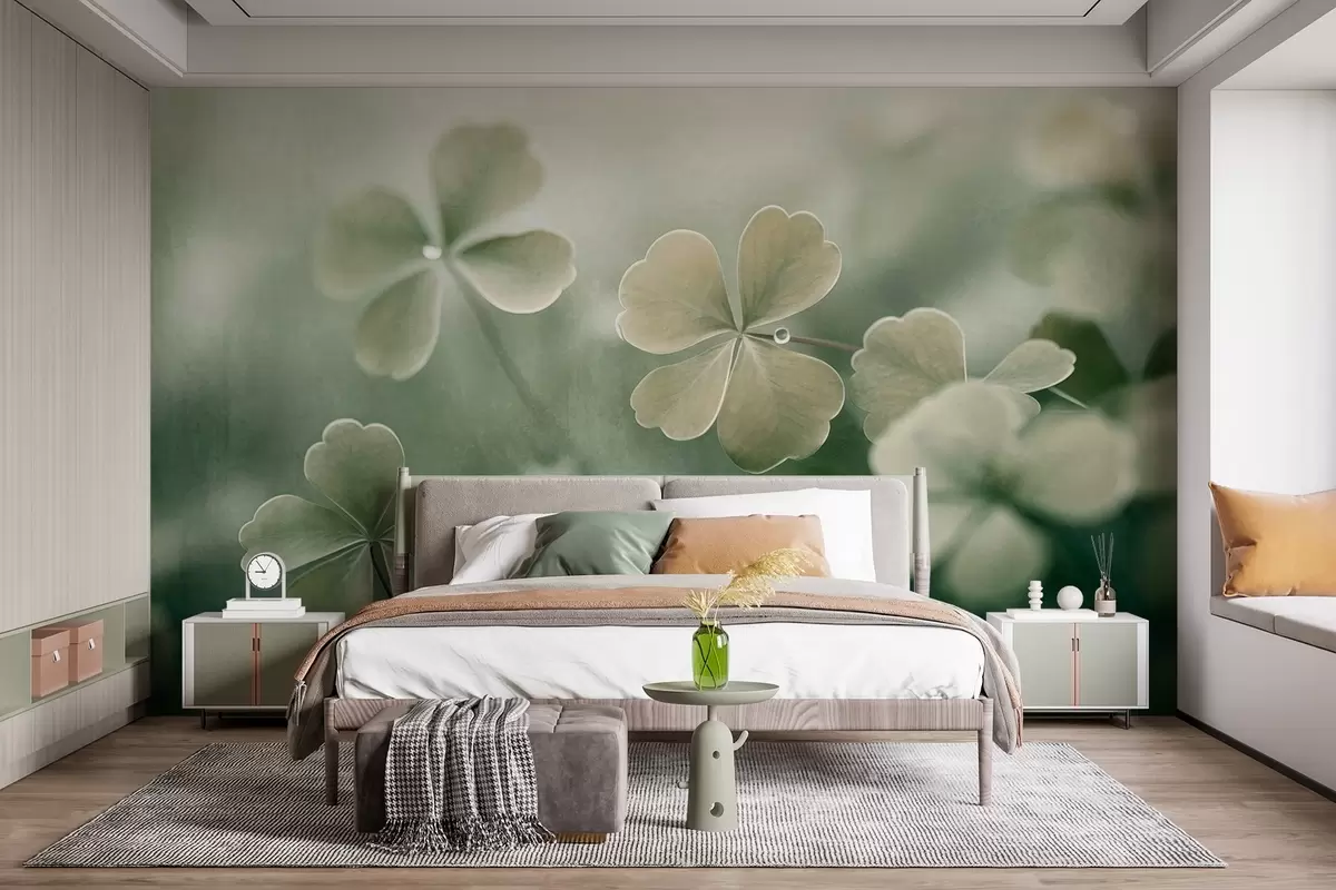 Fotomurales Tréboles de cuatro hojas con gotas de agua, color verde claro, enfoque suave, fondo borroso, impresión con textura Nr. w09376