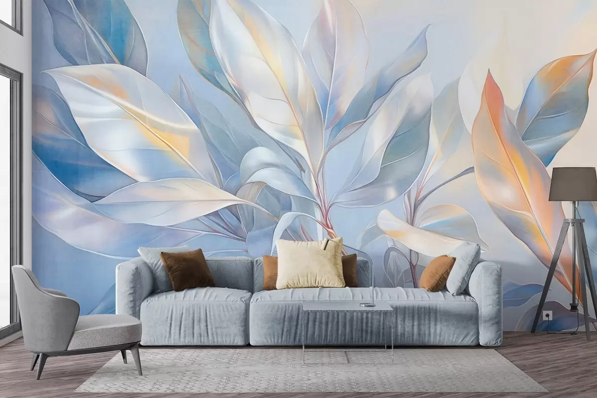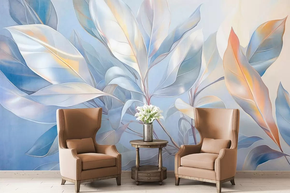 Fotomurales Hojas de magnolia con tonos blancos y azules, iluminación suave, composición elegante, venas de las hojas detalladas, pinceladas artísticas Nr. w09385