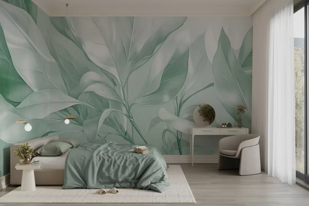 Fotomurales Hojas de magnolia con tonos blancos y verdes, iluminación suave, composición elegante, venas de las hojas detalladas, pinceladas artísticas Nr. w09385v1