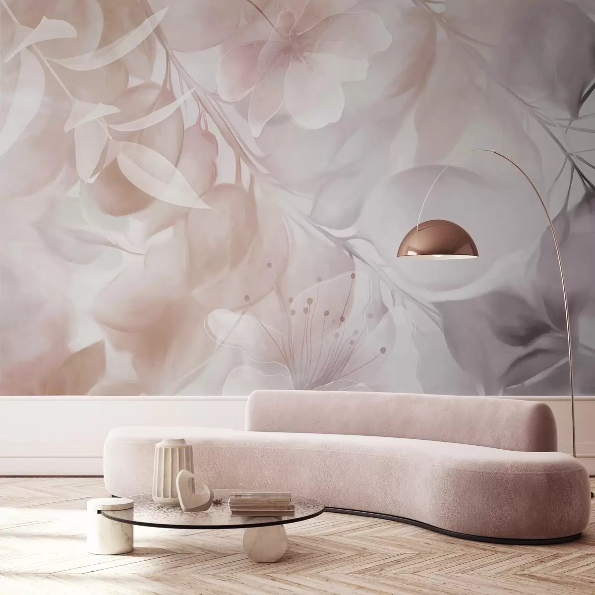 Fotomurales Arte floral con flores, hojas y ramas en tonos beige y marrón apagados, colores pastel suaves y efecto texturizado acuarela Nr. w09397