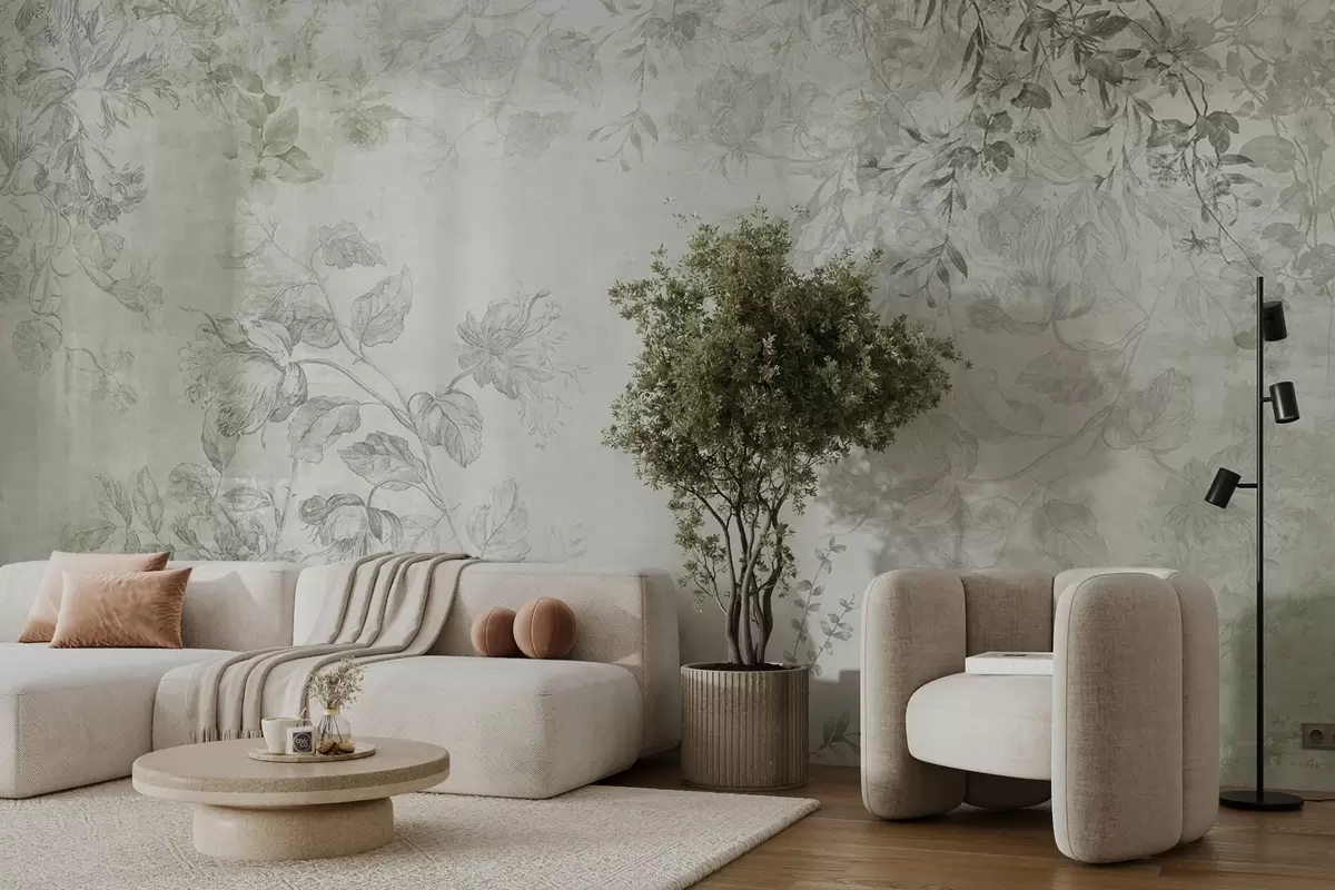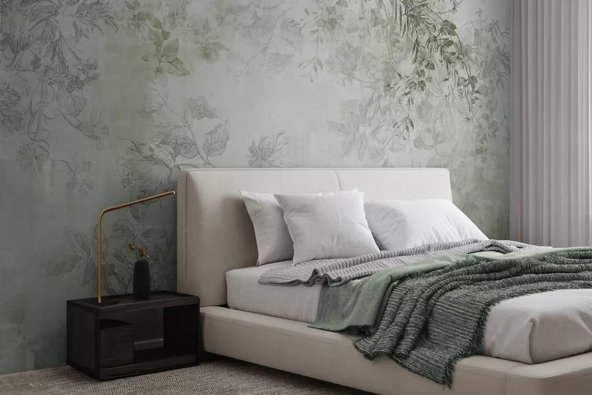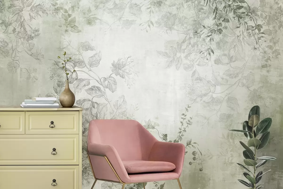 Fotomurales Arte floral vintage con textura, ilustraciones de delicadas flores y hojas de jardín en estilo dibujo, tonos verdes suaves Nr. w09402v2