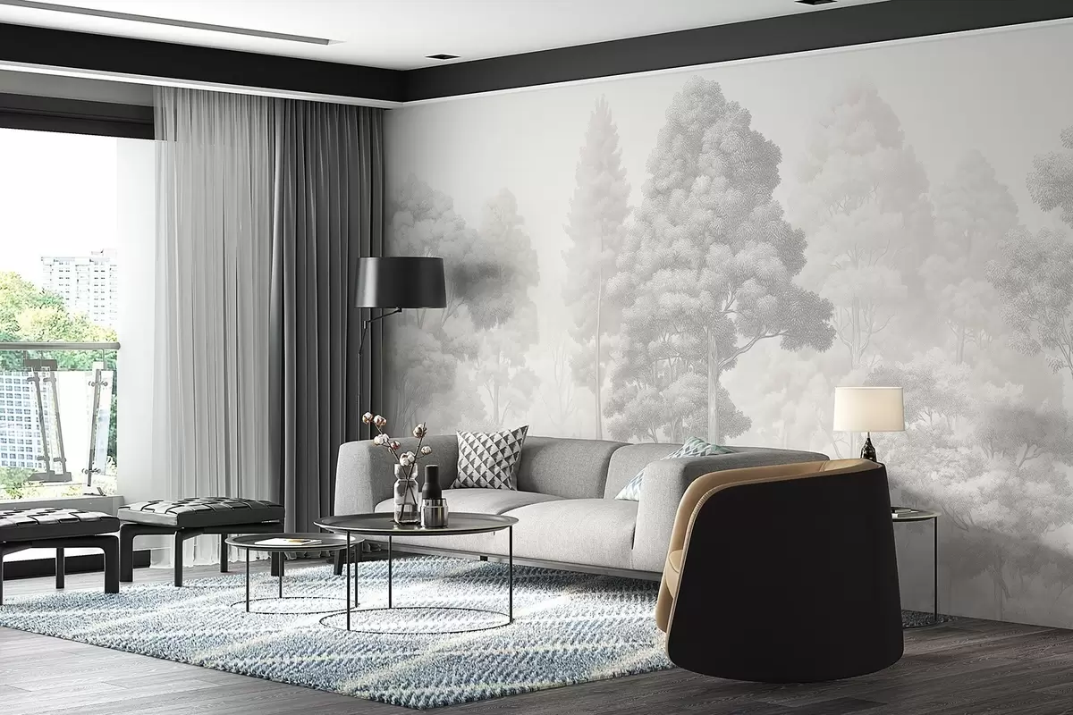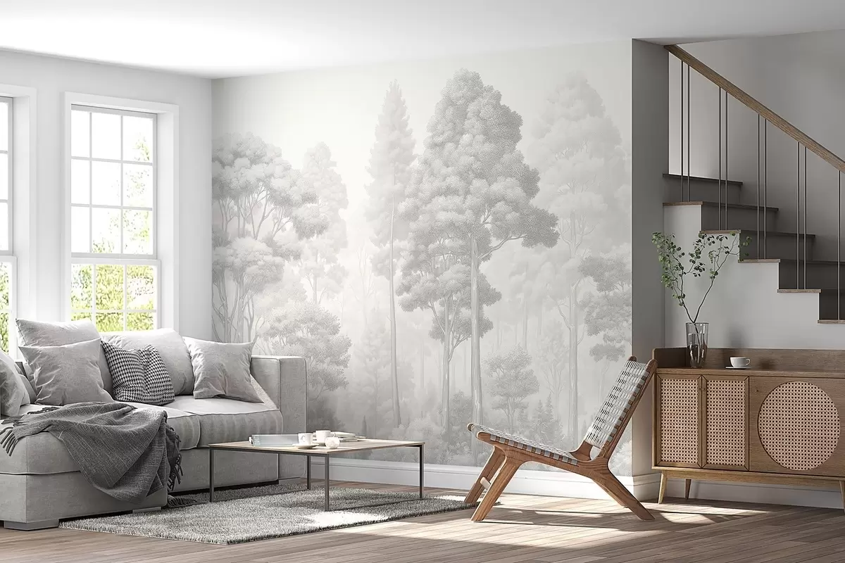 Fotomurales Paisaje forestal artístico en la técnica del sombreado gráfico en blanco y negro Nr. w09411