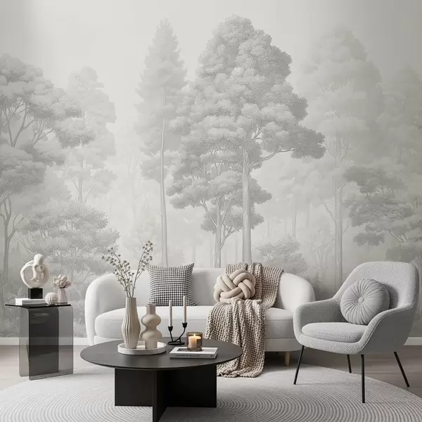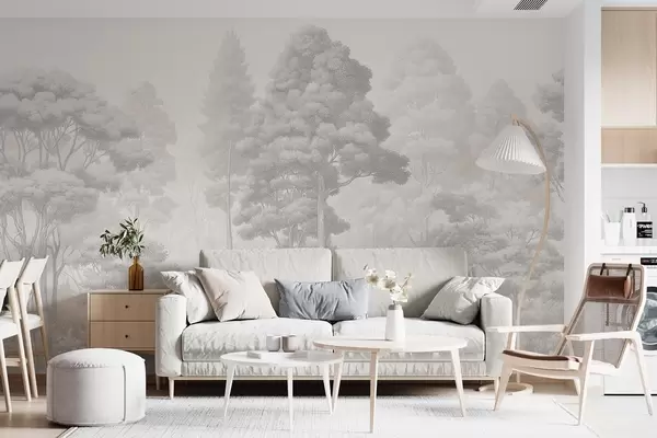 Fotomurales Paisaje forestal artístico en la técnica del sombreado gráfico en blanco y negro Nr. w09411